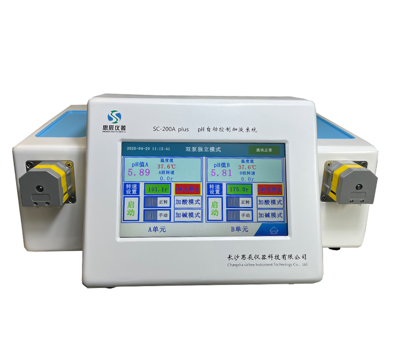 本系統是長沙思辰儀器研發團隊最新研制開發的第三代高精度pH自動控制系統,為高等院校、科研院所實驗室,中外研發企業及研發生產等部門精心設計制造的,并且擁有完全自主的知識產權。獲得了國家一項發明專利【ZL201410349779.8】及多項實用新型專利【ZL201721373766.X】;【ZL 201420406067.0】;【ZL201420406055.8】。整機采用PLC控制,并與定制的蠕動泵聯機進行加酸或加堿來自動調節容器中溶液pH的預設值。是催化、制藥、化工、電鍍、生化、生物發酵、植物提取物車間,科院院所等實驗室或生產中小試場所理想的pH監測自動控制系統。